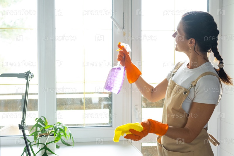 Женщина в резиновых перчатках и фартуке вручную моет оконный балкон дома тряпкой и шваброй внутри интерьера. Восстановление порядка и чистоты весной, уборка сервиза