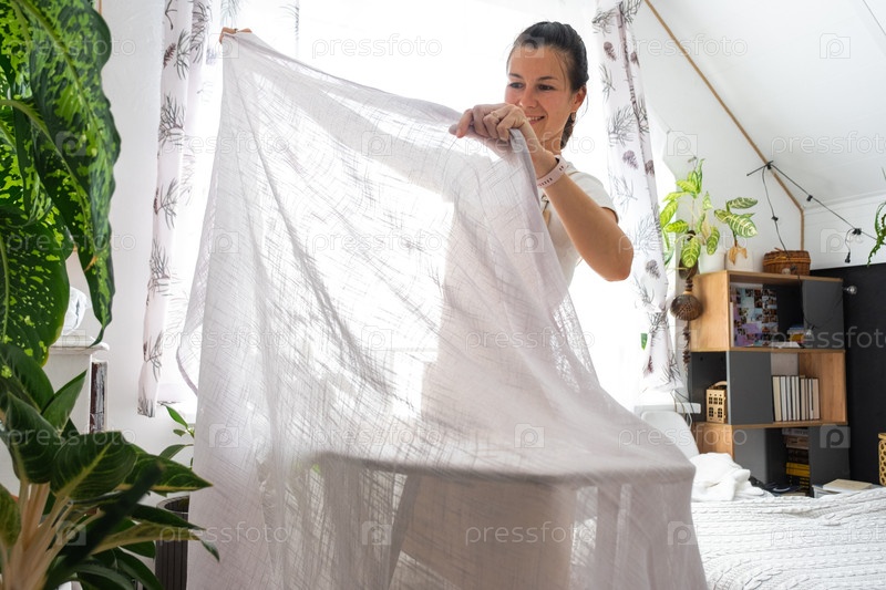 Домохозяйка женщины в фартуке утюги льняные шторы в комнате на гладильной доске