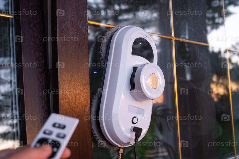 Робот-очиститель окон очищает окна в доме снаружи. Помощник по уборке, безопасная уборка окон, пульт дистанционного управления