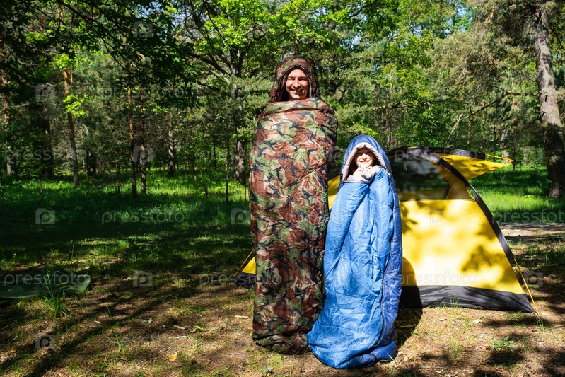 Семья туристов от отца и дочери позирует и весело танцует в спальных мешках возле палатки. Семейный отдых на открытом воздухе, кемпинг, походное снаряжение