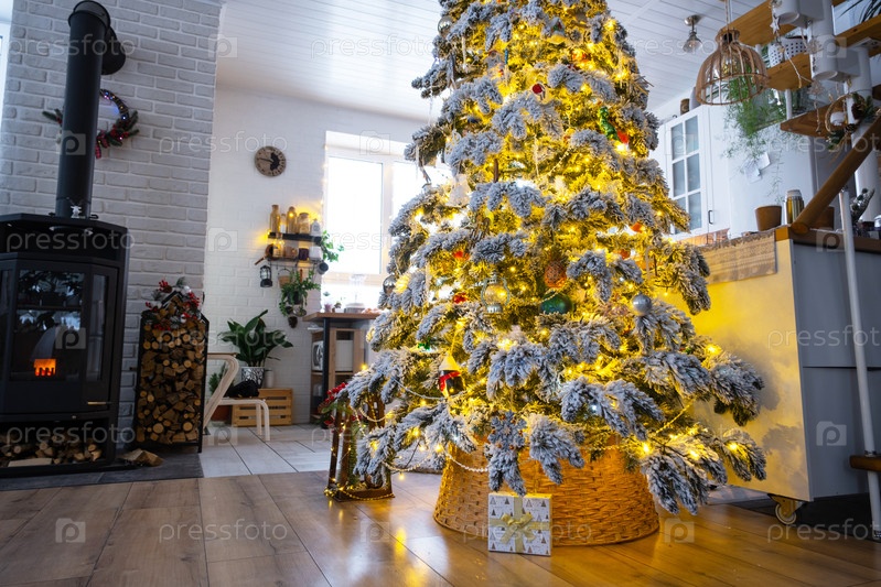 Праздничный белый современный интерьер дома оформлен на Рождество и Новый год в стиле лофт с черной плитой, камином, елкой. Горшечные растения, дрова в лесопилке