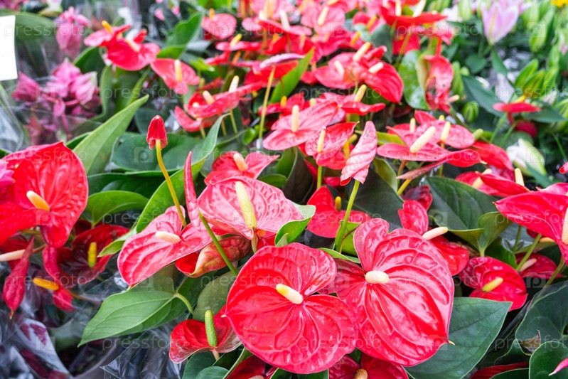 Цветы красного антурия в цветочном магазине - узор цветущих сердец мужского счастья, оптовая поставка комнатных растений, подарок на 8 марта, День святого Валентина, день рождения