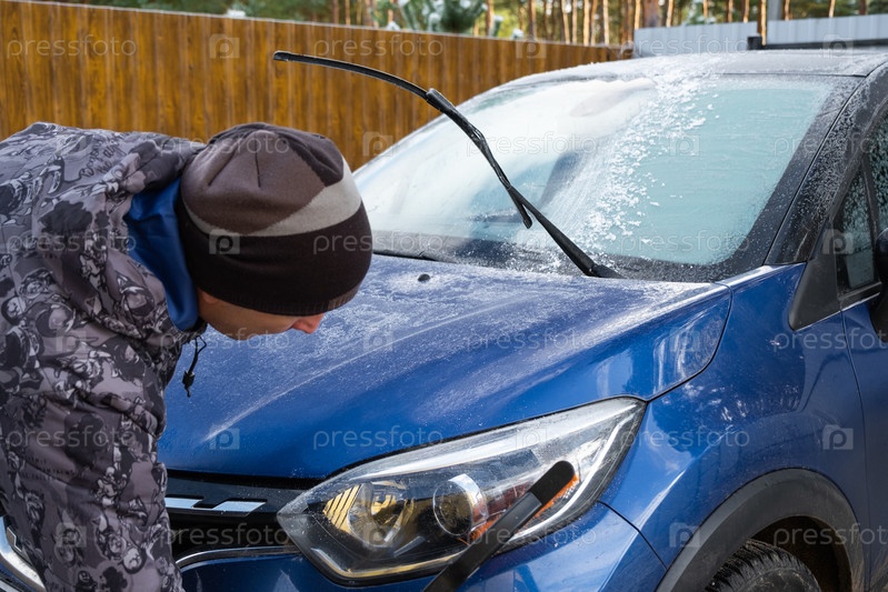 Мужчина очищает лобовое стекло автомобиля ото льда специальной кистью