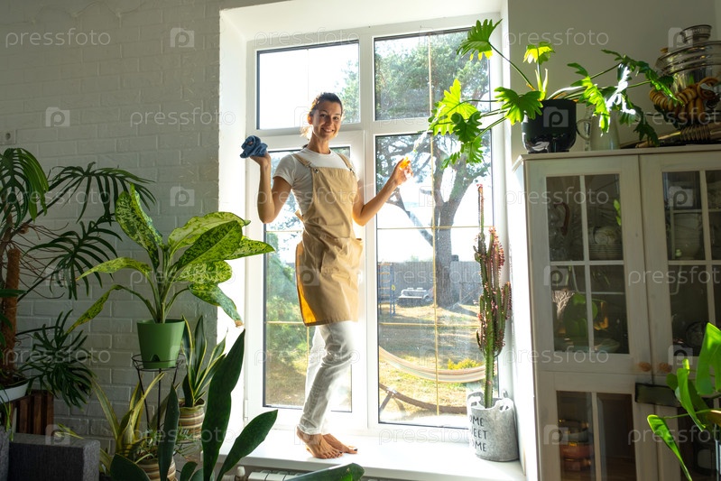 Женщина Портрет в фартук вручную моет окно дома тряпкой и шваброй внутри интерьера с домашними растениями на подоконнике. Восстановление порядка и чистоты весной, уборка сервиза