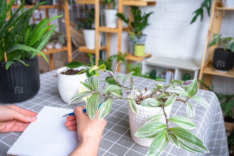 Пустой макет ноутбука с ручкой на столе с домашними горшечными растениями. Рекомендации по учету ухода за растениями