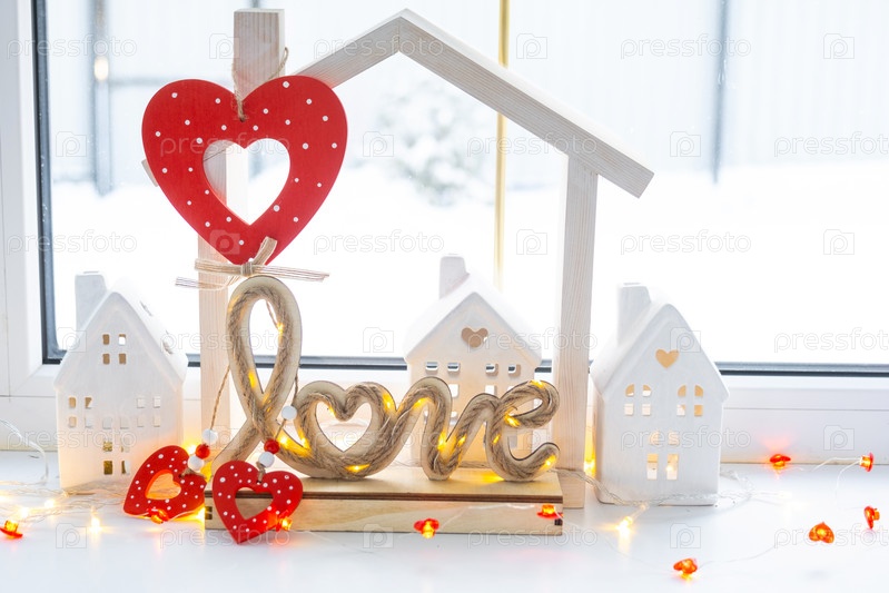 Ключ к крошечному дому уютного дома с декором Валентина на подоконнике. Подарок на день валентинок, семейное гнездо любви. дизайн, проект, переезд в новый дом, ипотека, аренда и покупка недвижимости