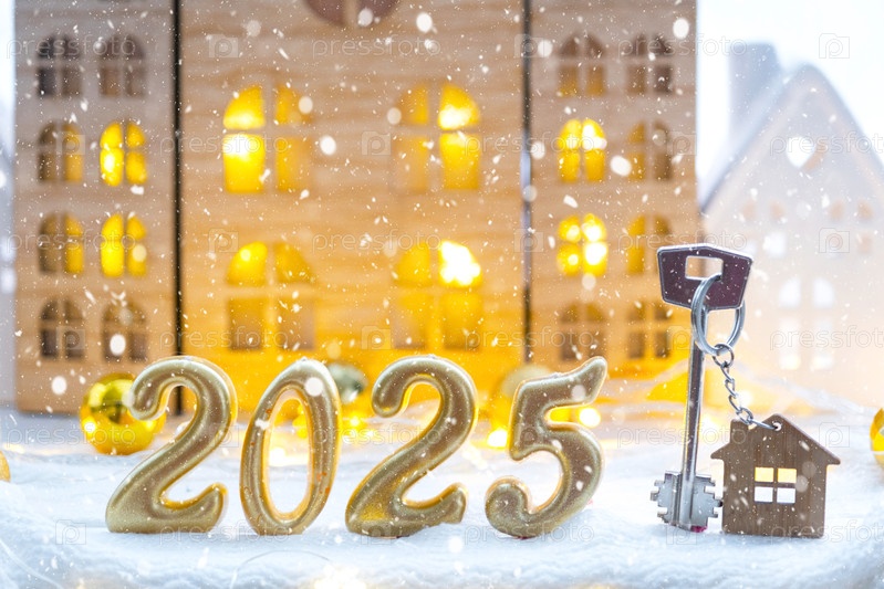 Золотые фигуры номер 2025 и крошечный дом на фоне уютных окон дома с теплым светом с праздничным декором звезд, снега и гирлянд. Приветственная открытка, С Новым годом, уютный дом