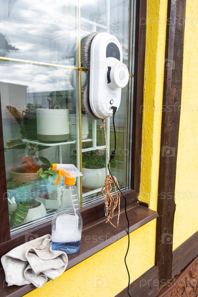 Робот-очиститель окон очищает окна в доме снаружи. Помощник по уборке, безопасная уборка окон, пульт дистанционного управления
