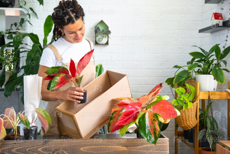 Женщина распаковывает коробку с посылкой горшечных цветов красного аглаонема - заказ завернутых тропических растений, доставка. Продажа, безопасная отправка растений из магазина, упаковка. Цветочный магазин, домашний бизнес
