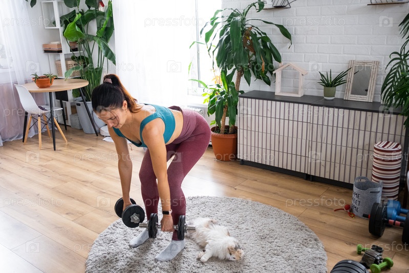 Женщина в спортивной форме занимается фитнесом и силовыми тренировками со штангой и гантелями дома в интерьере и с кошкой
