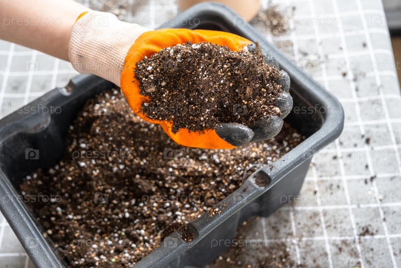 Ингредиенты для почвы домашних горшечных растений, торфа, земли, песка, перлита, вермикулита, кокоса. Смесь для посадки растений в перчатках цветочника смешивают в контейнере