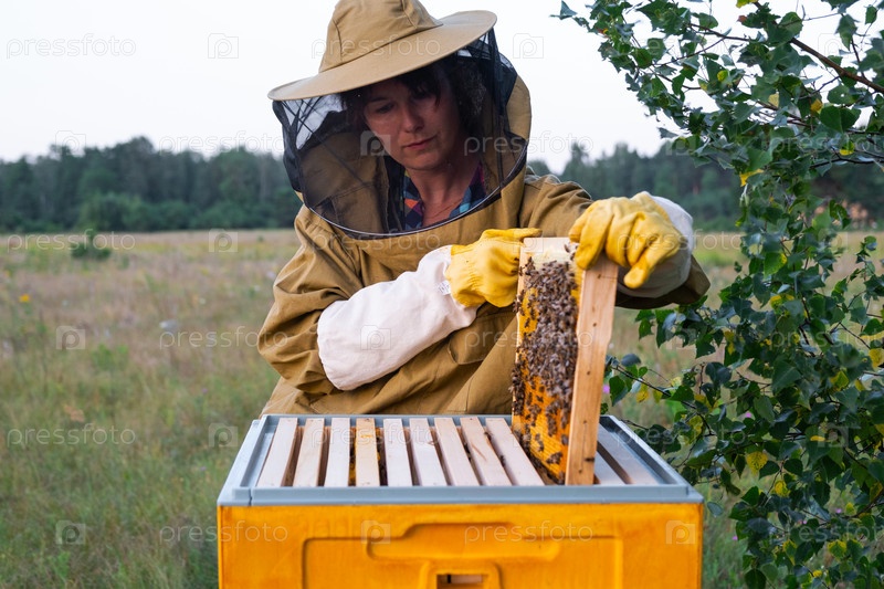 Пчеловод, женщина в защитном костюме от укусов пчел, держит в руках раму с медом из пчелиного улья. Пчеловодство, уход за ульем