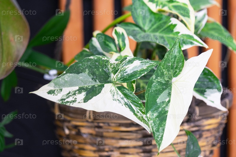Разноцветные листья Императорского Белого сингония крупным планом в плетеном горшке на фоне стойки в стиле лофт