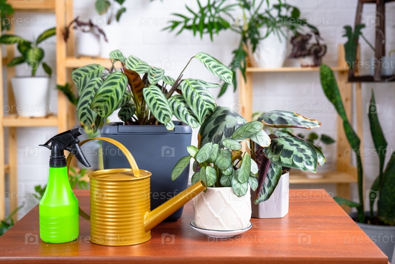 Группа популярных комнатных растений на столе в интерьере: Калатея, алоэ, диффенбахия, сансевьерия, фикус. Выращивание и уход за комнатным растением, зеленым домом, ирригация, удобрения