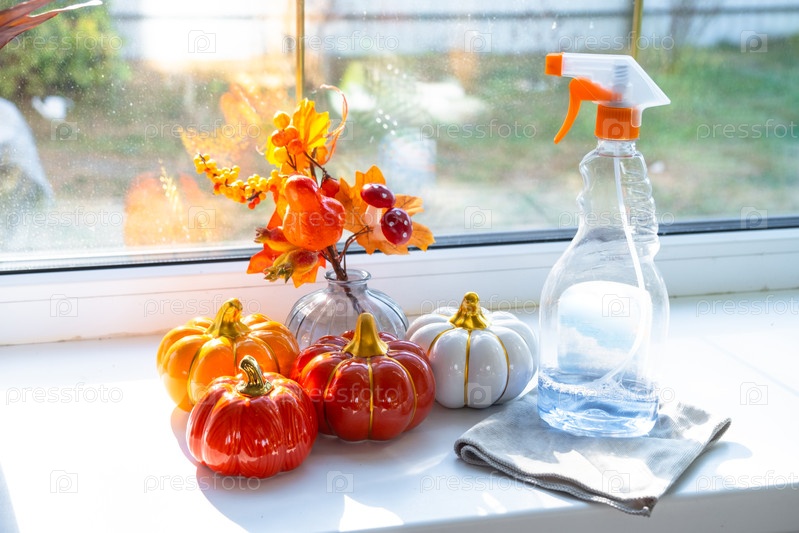 Тыквенный декор и оконные чистящие средства лежат на подоконнике с тряпкой, распыляют внутри интерьера с домашними растениями на подоконнике. Восстановление порядка и чистоты осенью, уборка сервиза