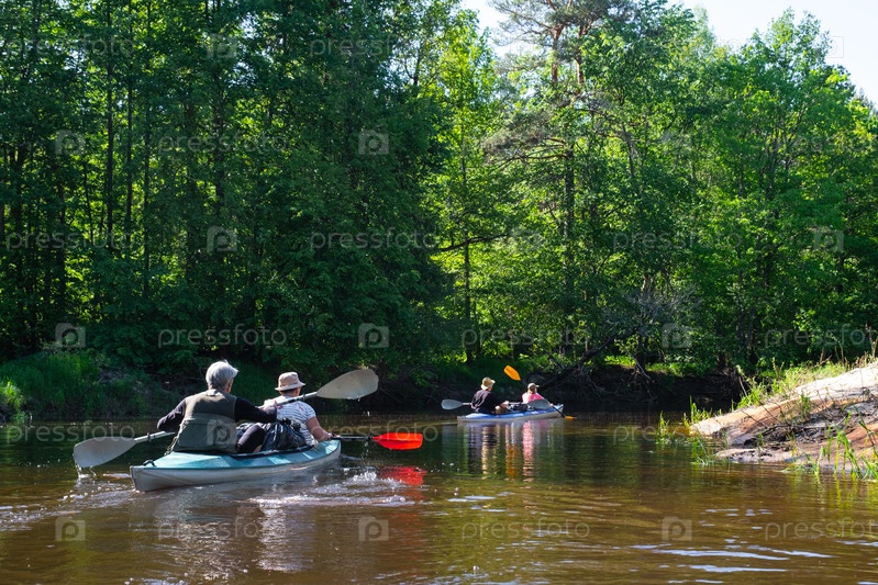 Групповая поездка на байдарках для сеньора и сеньоры. Пожилая пара и взрослая гребная лодка на реке, поход по воде, летнее приключение. Возрастные виды спорта, умственная молодость и здоровье, туризм, активная старость