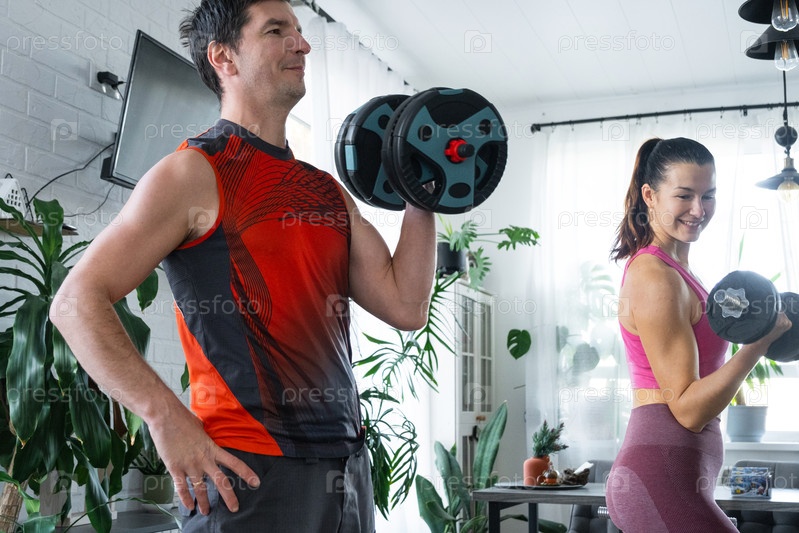 Совместная силовая тренировка мужа и жены дома с гантелями
