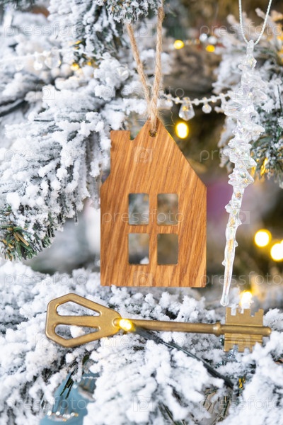 Ключ и крошечный дом в руке на заднем плане сказочной елки. Подарок на Новый год, Рождество. Строительство, дизайн, проект, переезд, страхование, ипотека, аренда и покупка недвижимости