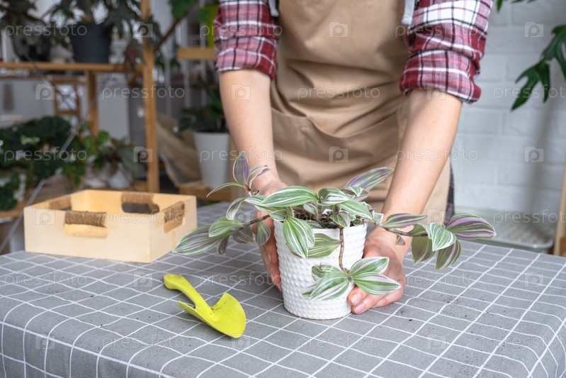 Пересадка и уход за домашним растением в новый домашний интерьер горшка. Женщина выращивает растения хобби, держит полезные растения
