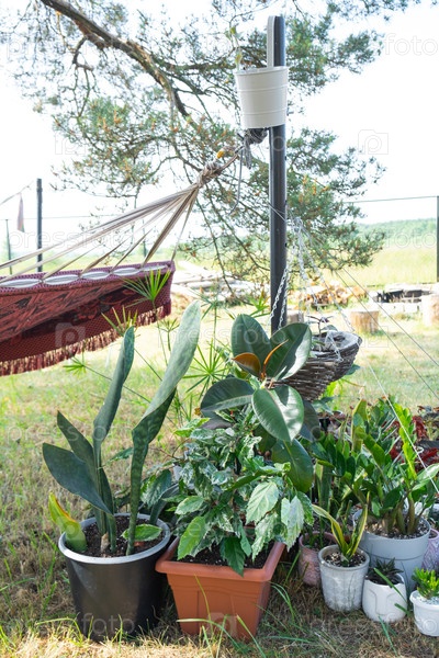 Домашние тропические растения — это группа, выходящая на улицу летом, чтобы ускорить рост. Ходячие домашние растения в горшках в саду