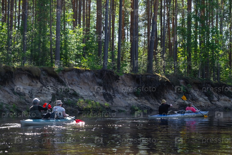 Групповая поездка на байдарках для сеньора и сеньоры. Пожилая пара и взрослая гребная лодка на реке, поход по воде, летнее приключение. Возрастные виды спорта, умственная молодость и здоровье, туризм, активная старость