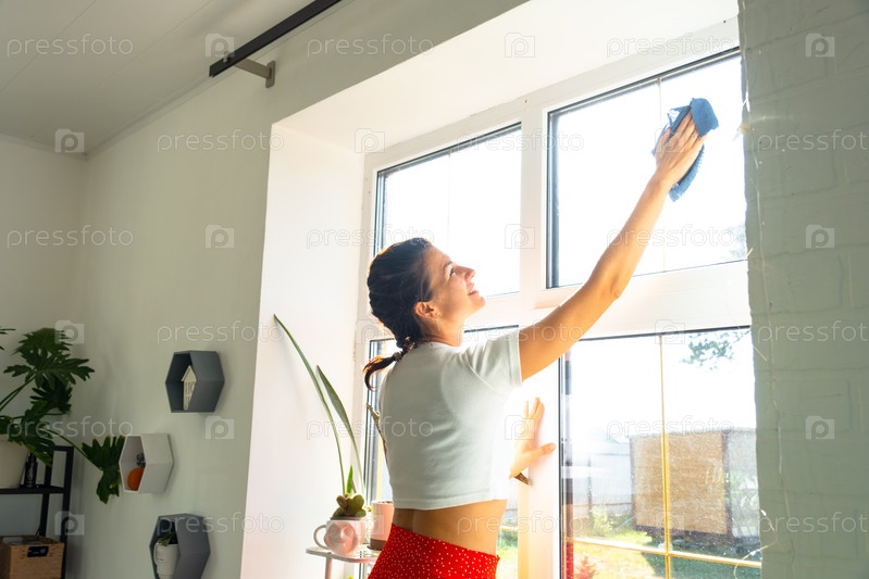 Женщина вручную моет окно дома тряпкой и шваброй внутри интерьера с домашними растениями на подоконнике. Восстановление порядка и чистоты весной, уборка сервиза