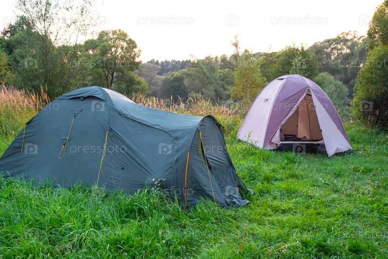 Установлена туристическая палатка в кемпинге на природе в лесу. Внутренний туризм, активные летние каникулы, семейные приключения. Экотуризм, спорт, поход. Копировать пространство, высмеивать