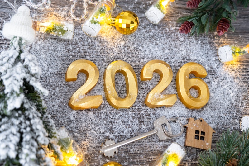 Золотые фигуры насчитывают Новый год на фоне крошечного дома с теплым светом и гирляндами. Приветственная открытка, С Новым годом, уютный дом