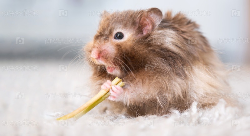 Забавный пушистый сирийский хомяк ест кричащий, удивленный открытым ртом. Питание для грызунов, витамины. Закрытие, юмор