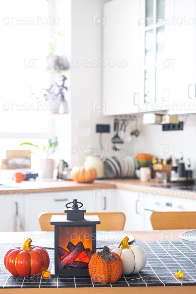 Декор белой классической кухни с тыквами, гирляндами, поздней для Хэллоуина и урожая с фигуркой дома. Осеннее настроение в домашнем интерьере, современный стиль лофта. недвижимость, страхование, ипотека