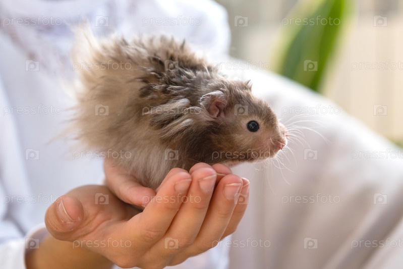 Забавный пушистый любопытный сирийский хомяк, сидящий на руках у ребенка. Домашний прирученный питомец, ручной, Закрытие, копирование пространства