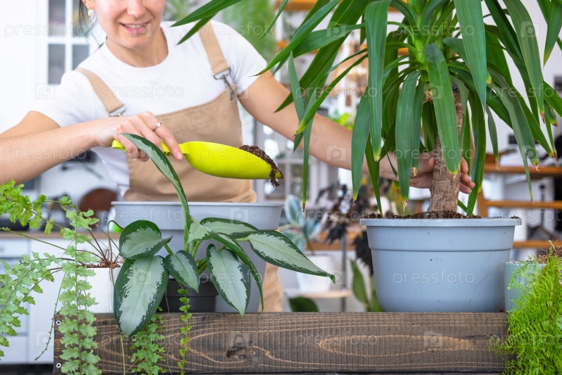 Пересадка и уход за домом растения Юкка в новый горшок в интерьере дома. Женщина разводит и выращивает растения хобби, держит тропическое растение Дракена