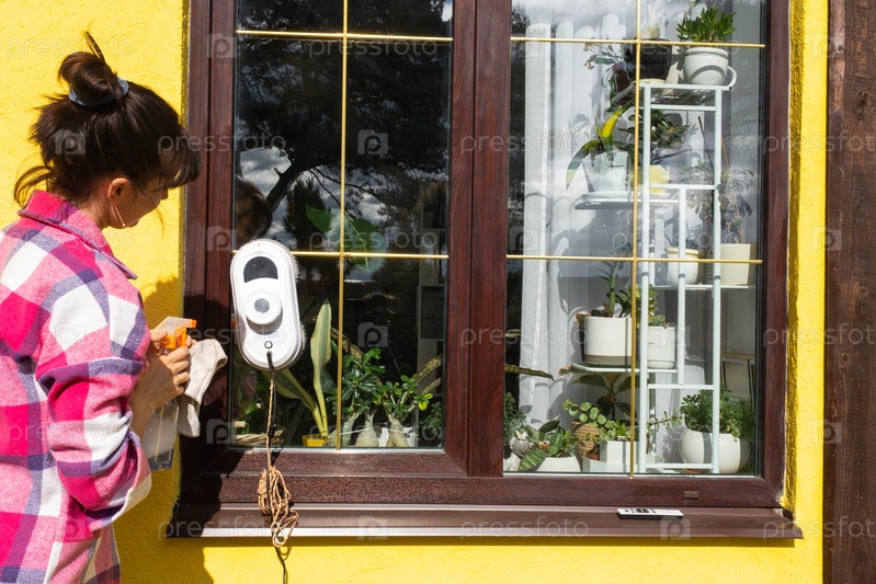 Женщина запускает робота-уборщика окон дома снаружи с желтым фасадом. Домашняя робототехника, домашний помощник, уборка сервиза