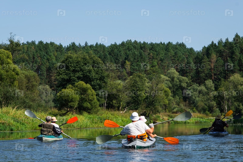 Групповая поездка на байдарках для сеньора и сеньоры. Пожилая пара и взрослая гребная лодка на реке, поход по воде, летнее приключение. Возрастные виды спорта, умственная молодость и здоровье, туризм, активная старость