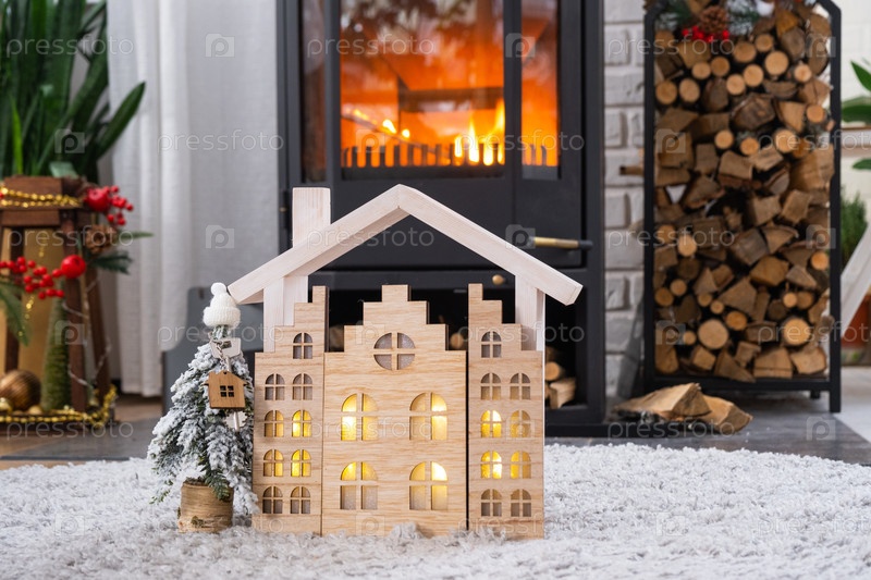 Ключ на рождественской елке и крошечный домик на уютном доме с рождественским декором возле горящего печного камина. Подарок на Новый год. Страхование, переезд в новый дом, ипотека, аренда и недвижимость