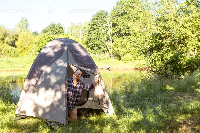 Счастливая женщина в клетчатой рубашке выглядывает из туристической палатки на поход по берегу реки утром. Кемпинг на природе, ночь в дикой природе, семейные праздники и приключения