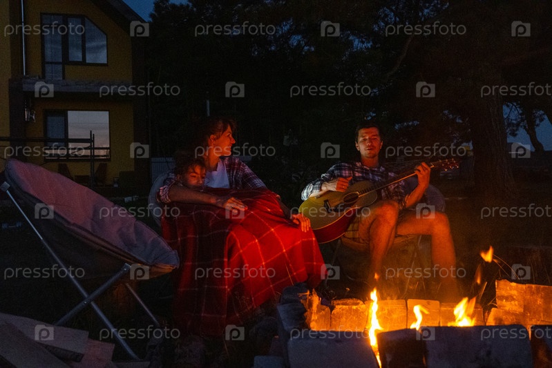 Семья сидит у костра, мужчина играет на гитаре, женщина слушает и поет, дочь завернулась в одеяло. Семейный летний вечер во дворе дома