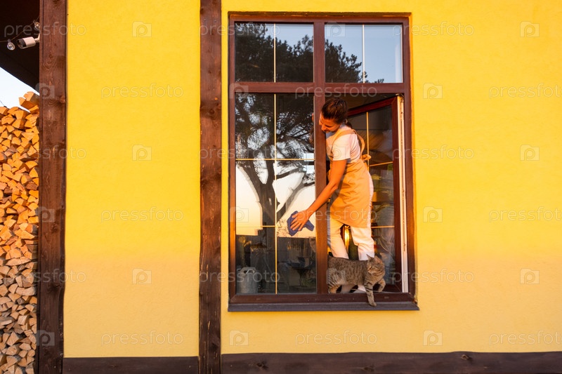 Женщина в фартуке вручную моет окно дома тряпкой с распылителем и шваброй снаружи. Безопасность на высоте, восстановление порядка и чистоты весной, уборка