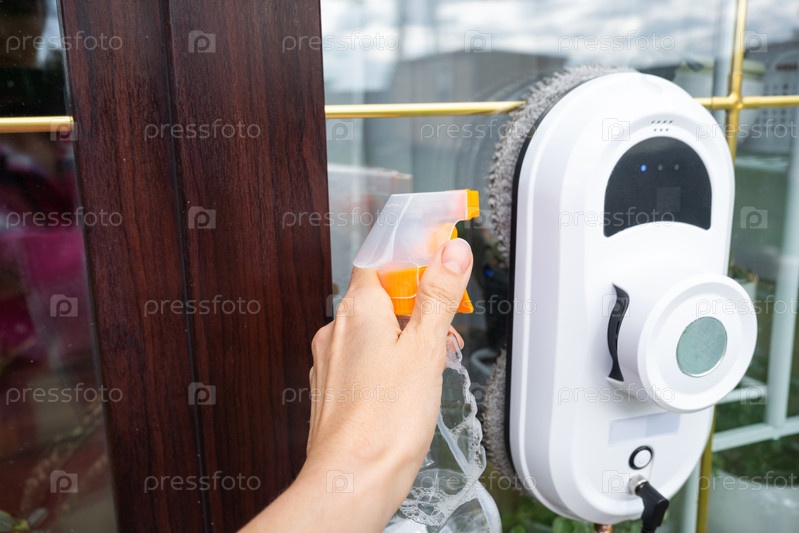 Робот-очиститель окон очищает окна в доме снаружи. Помощник по уборке, безопасная уборка окон, пульт дистанционного управления