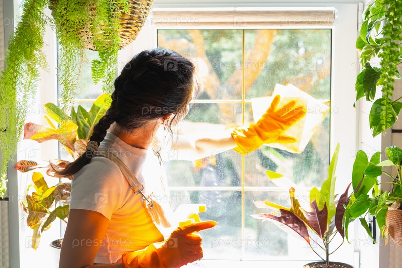 Женщина в резиновых перчатках и фартуке крупным планом вручную моет окно дома тряпкой и шваброй внутри интерьера с домашними растениями на подоконнике. Восстановление порядка и чистоты, уборка сервиза