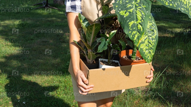 Флорист упаковывает комнатные растения в коробку для доставки покупателю. Продажа, безопасная отправка растений из магазина, посылка. Цветочный магазин, домашний малый бизнес, питомник
