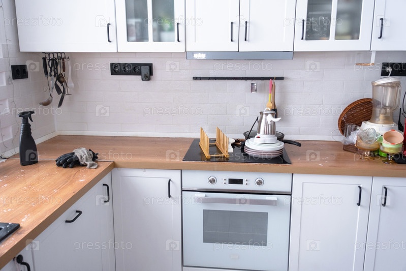 Общая уборка на кухне, очистка поверхности и продукты для удаления жира, беспорядок