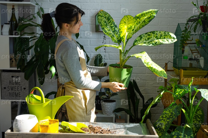 Пересадка и уход за домашним растением Diefenbachia Banana в новый горшок в домашнем интерьере. Женщина разводит и выращивает растения как хобби, держит вариетальную диффенбахию с большими пятнистыми листьями, больших размеров