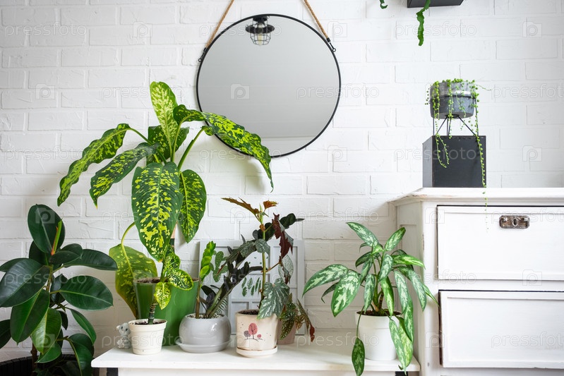 Диффенбахия Чита с большими пестрыми листьями в белом интерьере в стиле лофт. Выращивание декоративных внутренних растений в горшке