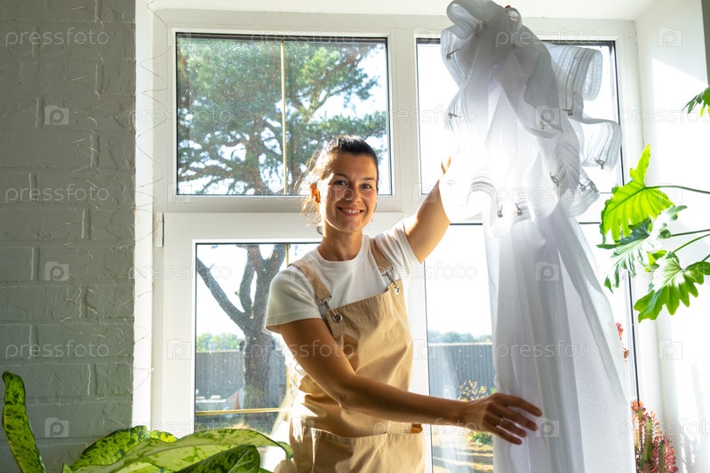 Женщина в фартуке вешает прозрачные тюльские шторы на большие окна в доме внутри интерьера с горшечными растениями. Весенняя уборка, уборка