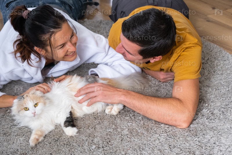 Муж и жена играют с домашним котом на ковре