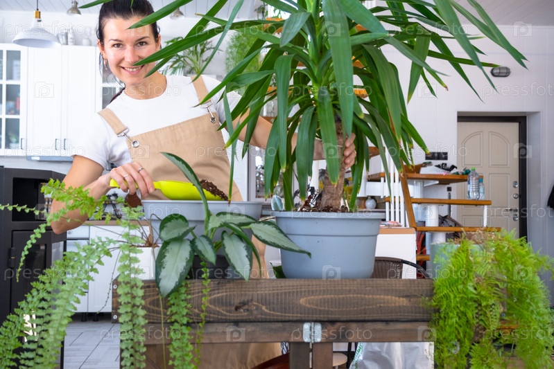 Пересадка и уход за домом растения Юкка в новый горшок в интерьере дома. Женщина разводит и выращивает растения хобби, держит тропическое растение Дракена