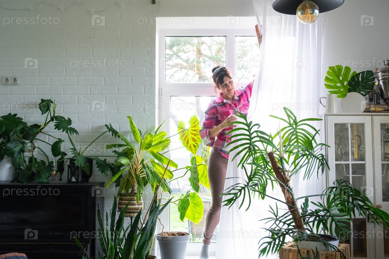 Женщина вешает прозрачные тюльские шторы на большие окна в доме внутри интерьера. Весенняя уборка, уборка