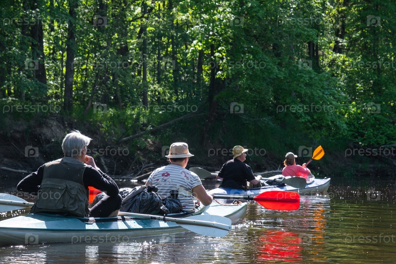 Групповая поездка на байдарках для сеньора и сеньоры. Пожилая пара и взрослая гребная лодка на реке, поход по воде, летнее приключение. Возрастные виды спорта, умственная молодость и здоровье, туризм, активная старость