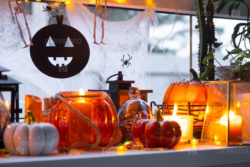 Праздничный декор дома на подоконнике к Хэллоуину - тыква, Джек о фонари, черепа, паутина, пауки, скелеты, свечи и гирлянда - уютное и страшное настроение